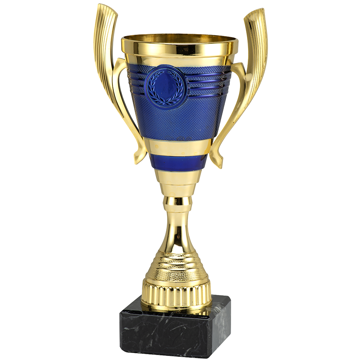 Cupă elegantă pentru premiere, realizată din plastic cu finisaj auriu și albastru, montată pe bază solidă din marmură neagră.