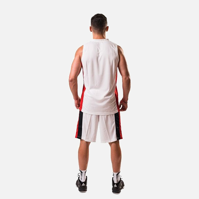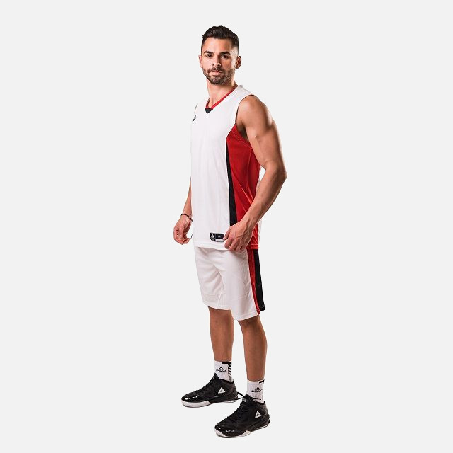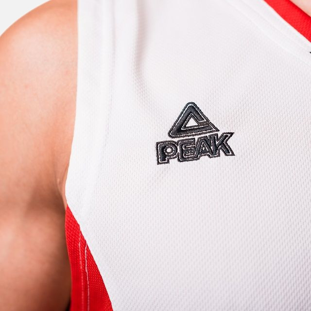 Set maiou/short baschet PEAK Floater alb/rosu/negru, realizat din material 100 % poliester, care confera o
