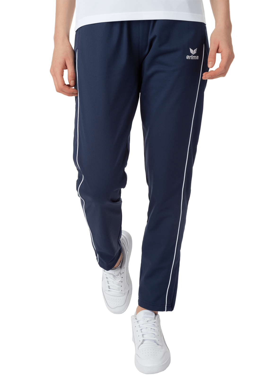 Pantalonii de trening ERIMA Shooter Navy/Alb sunt ideali pentru antrenamente și activități sportive, oferind un design